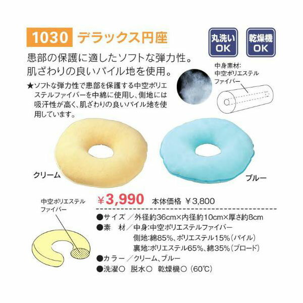 ●サイズ(約)/外径36×内径10×厚さ8cm ●重さ/400g ●材質/中材:ポリエステルファイバー、表地:パイル、裏地:ブロード ●洗濯○ 脱水○ 乾燥機○(60℃) ・丸洗いできる患部保護に適した2タイプの床ずれ防止クッション。