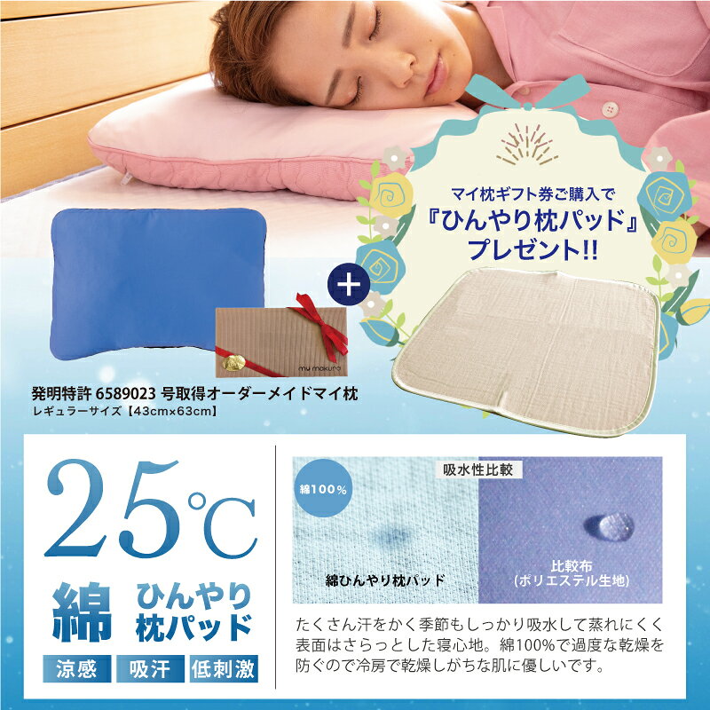 ★ひんやり枕パッド[ベージュ]プレゼント★特許取得 オーダーメイドマイ枕お仕立てギフト券 ワイド 45×70cm 高さ調整 無料 頭痛 肩こり 首こり 不眠症 ストレートネック いびき 快眠 睡眠 ギフト 券 プレゼント 贈り物 ラッピング無料 枕 まくら マクラ マイまくら